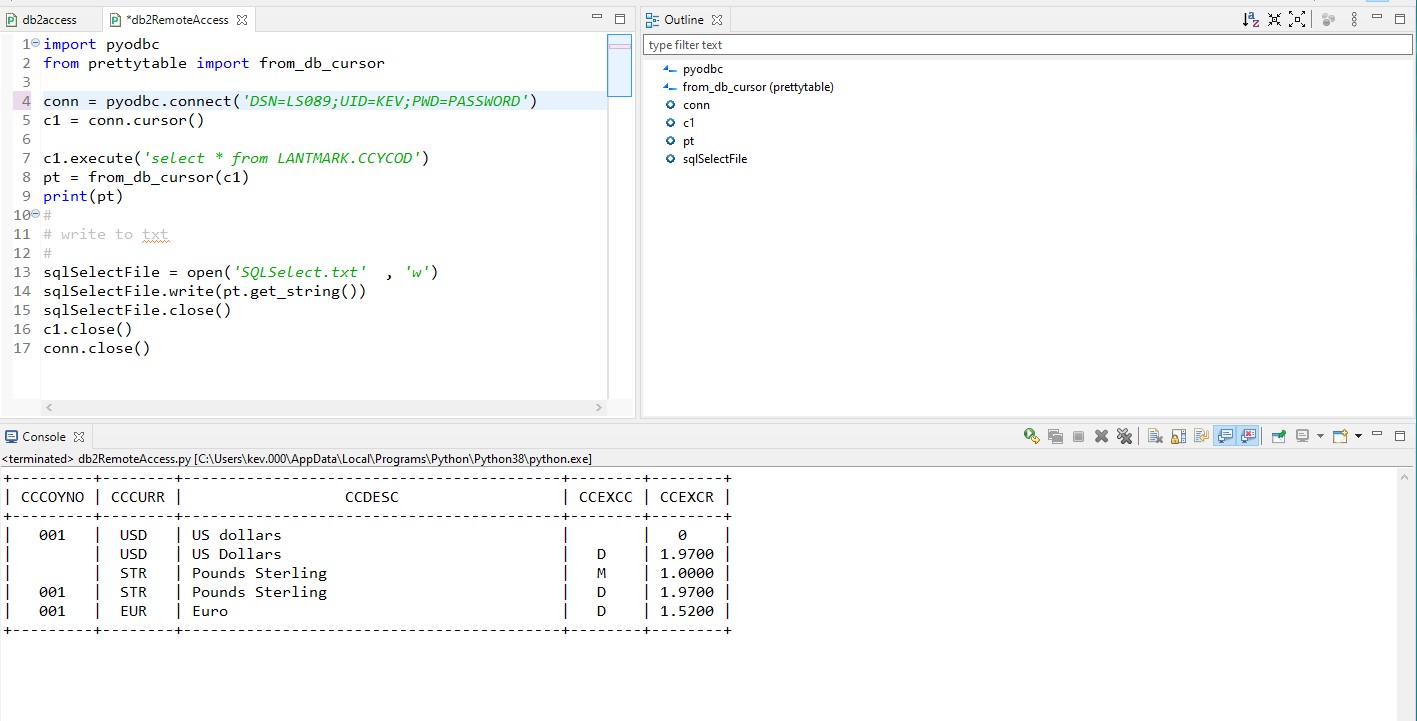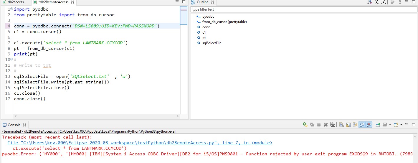 This small python script connects to an IBMi database and the SQL select statement pulls the entire file from the database, the results are shown below. The last three lines before the close statements create a remote text file(it could easily be a spreadsheet) from the data extracted.