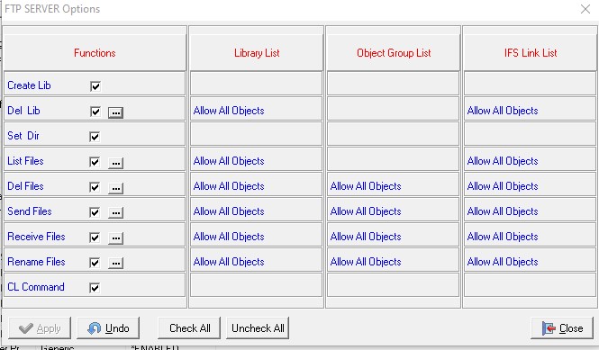 The ftp server access control gives me granular control of various ftp functions and further I can decide which libraries can be modified if so required.