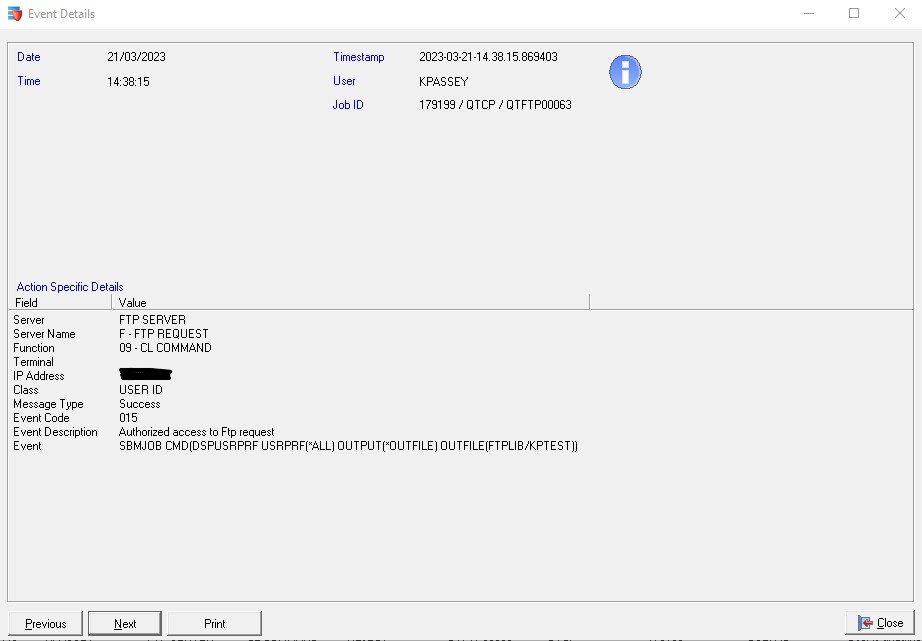 Without a security product installed on your IBMi system, FTP commands can operate undetected, without triggering any alerts. As a result, any attempt to use IBMi's auditing products will only record the access after the fact, without blocking it in real-time.